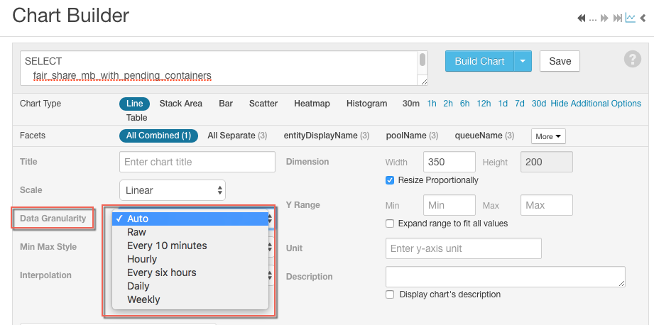 To build charts that query time series data using the Cloudera Manager Admin console, go to . When building charts, it may be useful to choose the data granularity by clicking the Show additional options link on the chart builder page and then selecting the Data Granularity drop-down list. See Charting Time-Series Data.