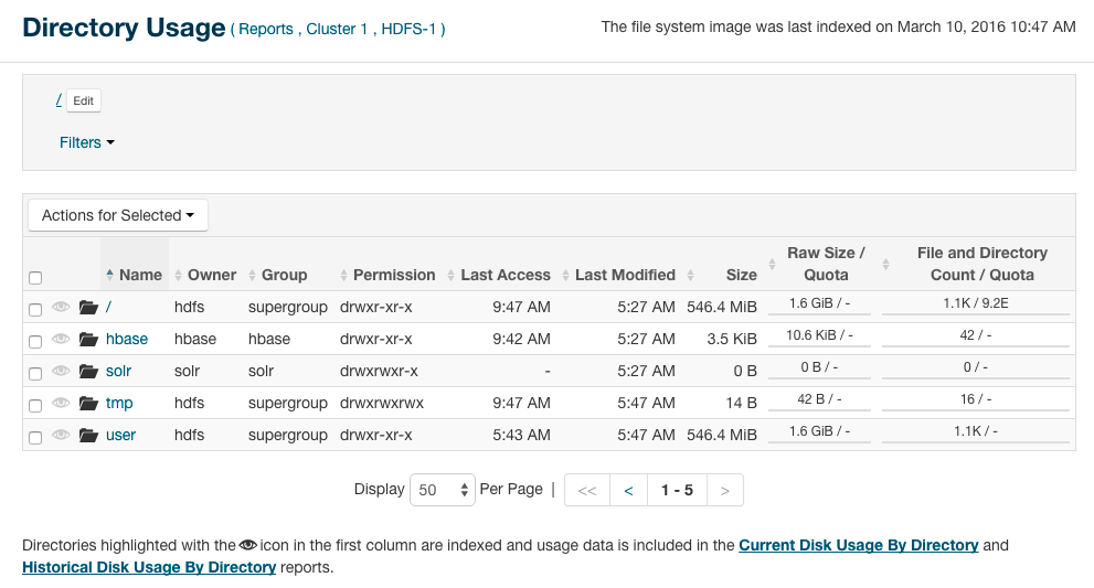 The directory usage report allows you to browse the HDFS filesystem in a way that is similar to the HDFS File Browser . However, the Directory Usage Report also allows you to sort the listings and select multiple items and perform actions on them. You can also view the last access time, the last modified time of any file in a directory, and the total size of all files in the directory. This usage information is updated on an hourly basis.