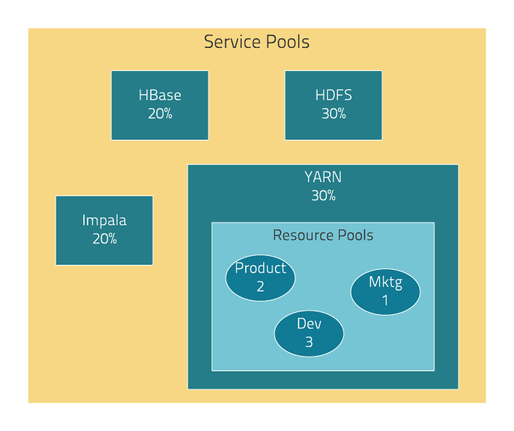 For example, the following figure illustrates static pools for HBase, HDFS, Impala, and YARN services that are respectively assigned 20%, 30%, 20%, and 30% of cluster resources.
