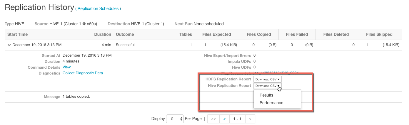 - To view performance of the HDFS phase, click Download CSV next to the HDFS Replication Report label and select one