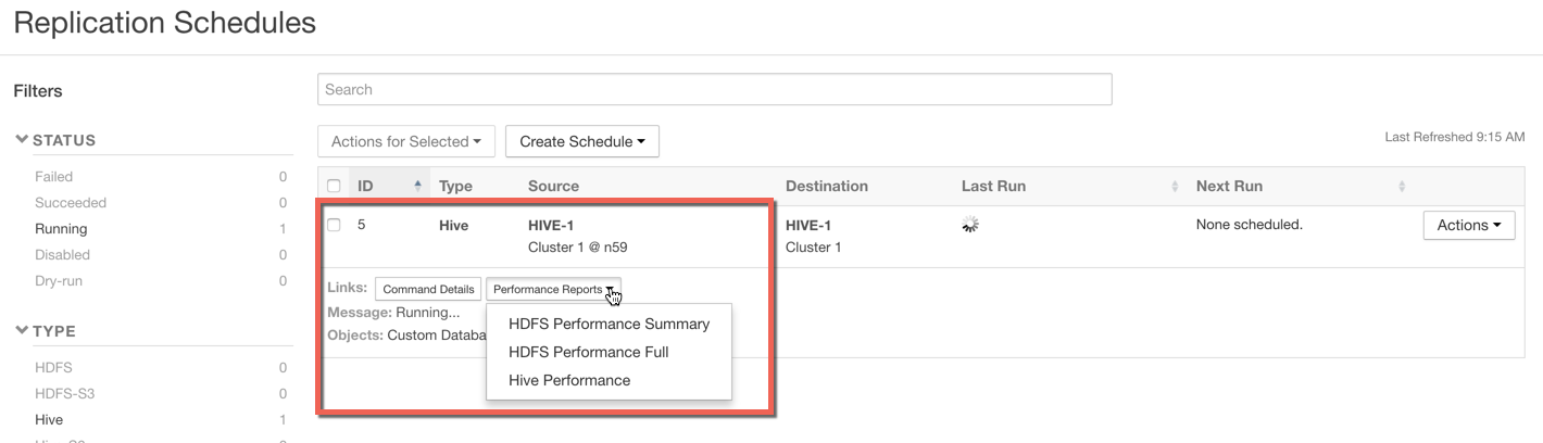 to expand the display of the selected schedule. - To view performance of the Hive phase, click Download CSV next to the Hive Replication Report label and select one