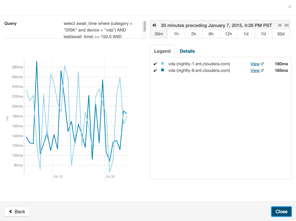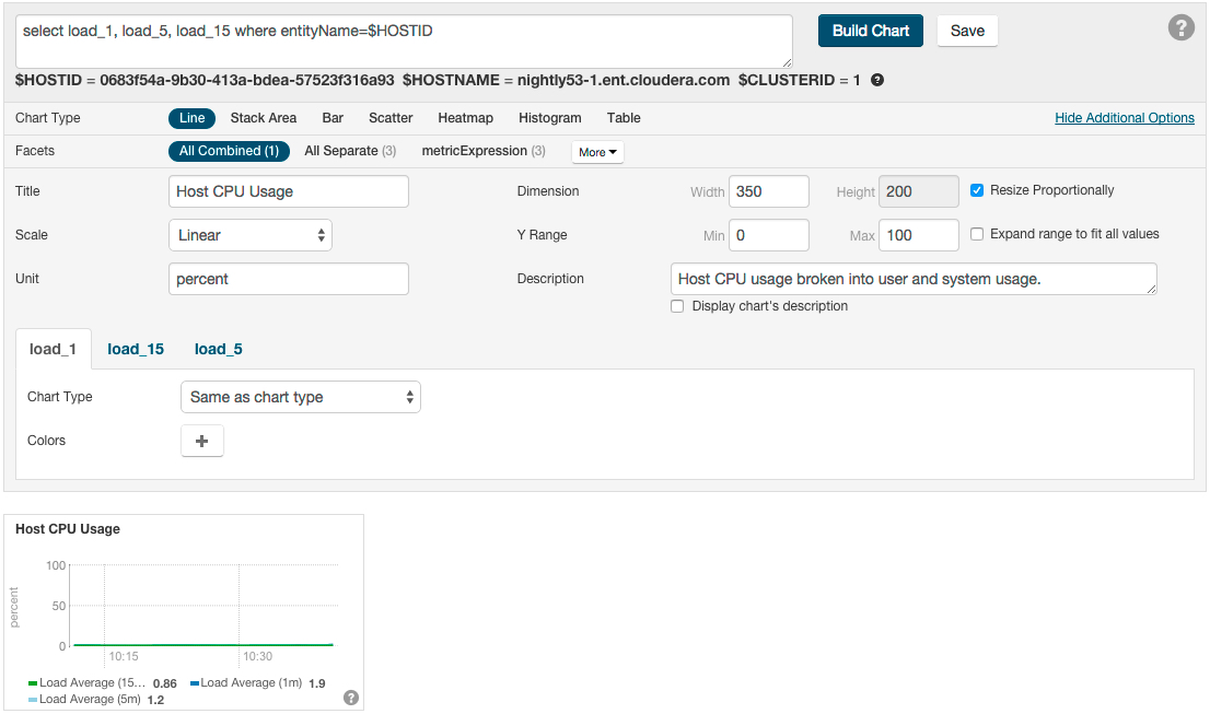 Cloudera Manager enables you to enter a query for a time series, chart the time-series data, group (facet) individual time series if your query produced multiple time series, and save the results as a dashboard.