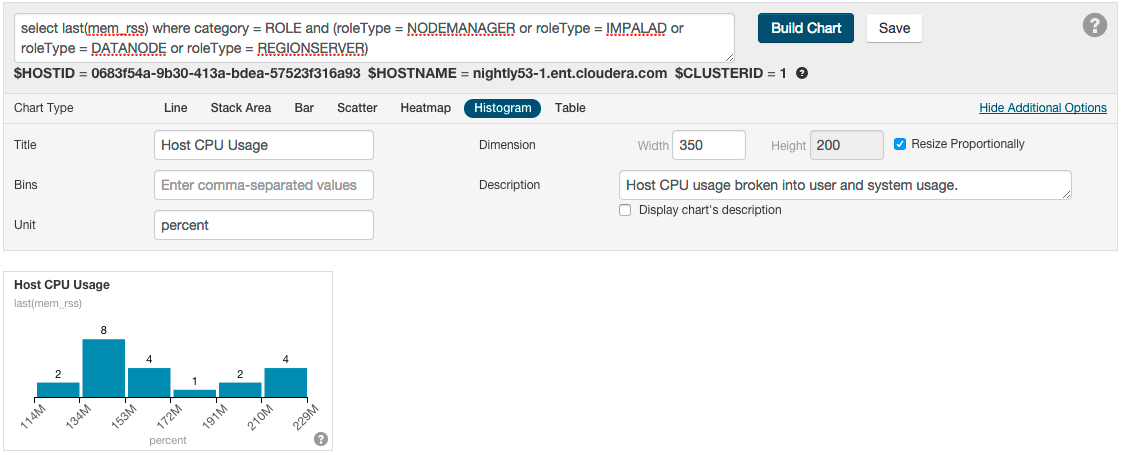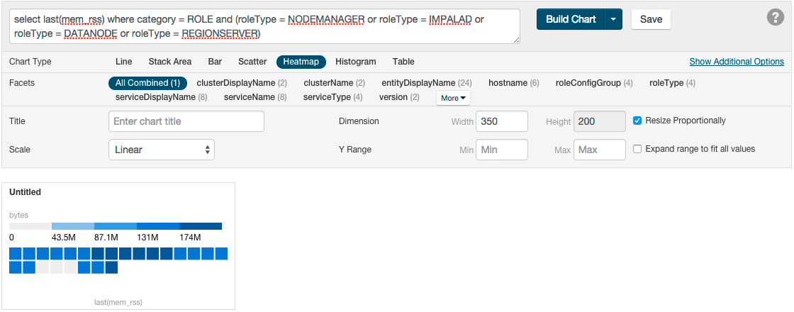 Note: Heatmaps and histograms render charts for a single point as opposed to time series charts that render a series of points. For queries that return time series, Cloudera Manager will generate the heatmap or histogram based on the last recorded point in the series, and will issue the warning: "Query returned more than one value per stream. Only the last value was used." To eliminate this warning, use a scalar returning function to choose a point. For example, use select last(cpu_percent) to use the last point or select max(cpu_percent) to use the maximum value (in the selected time range).