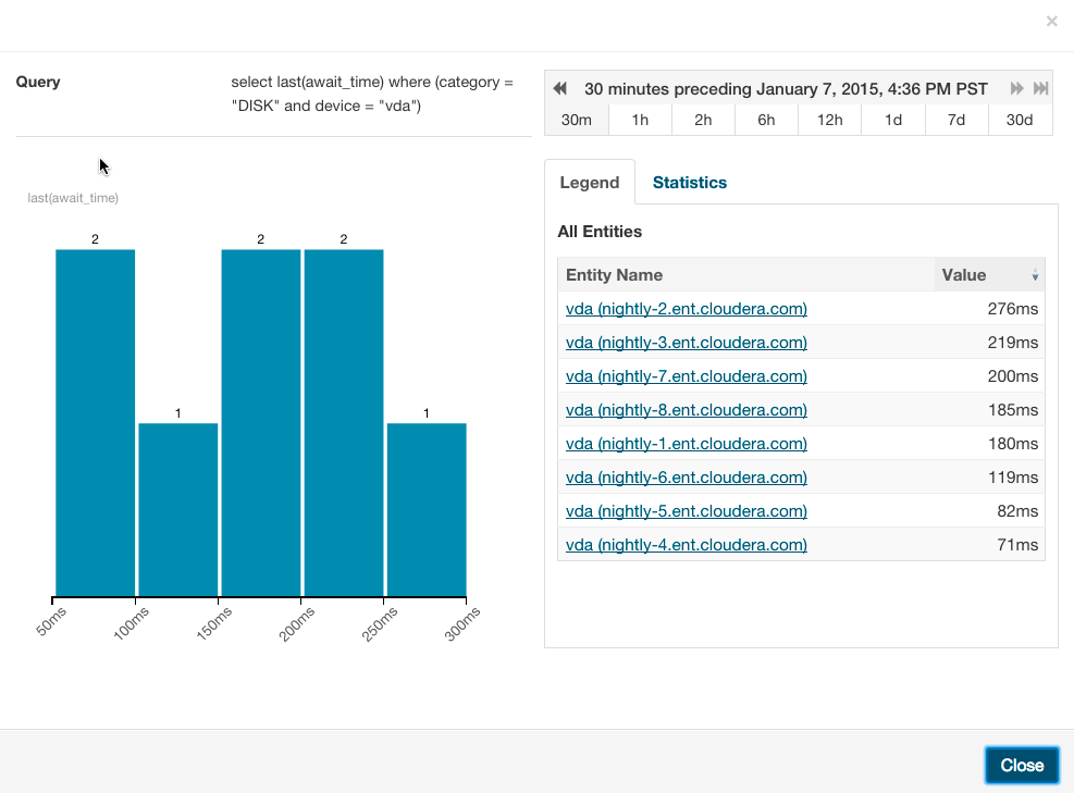 • Mousing over the upper right corner of a histogram and clicking opens a pop-up containing the query that generated the chart, an expanded view of the chart, a list of entity names and links to the entities whose metrics are represented by the histogram bars, and the value of the metric for each entity. For example, clicking the following histogram