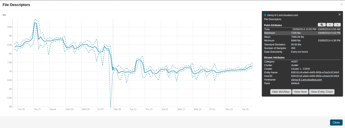 These differ from non-aggregate data points by having the aggregateStatistics structure. Note that the value field in the point structure will always be the same as the aggregteStatistics mean field. The Cloudera Manager UI presents aggregate statistics in a number of ways. First, aggregate statistics are made available in the hover detail and chart popover when dealing with aggregate data. Second, it is possible to turn on and turn off the display of minimum and maximum time-series streams in line charts of aggregate data. These streams are displayed using dotted lines and give a visual indication of the underlying metric values data range over the time considered, entities considered or both. These lines are displayed by default for single stream line charts of aggregate data. For all line charts this behavior can be turned on and turned off using the chart popover.