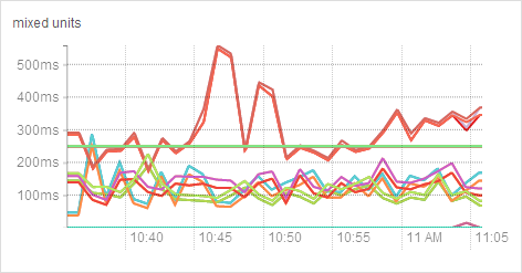 Suppose that you want to retrieve the latencies for all disks on your hosts, compare them, and show a threshold on the chart to easily detect outliers. Use the following query to retrieve the metrics and the threshold: