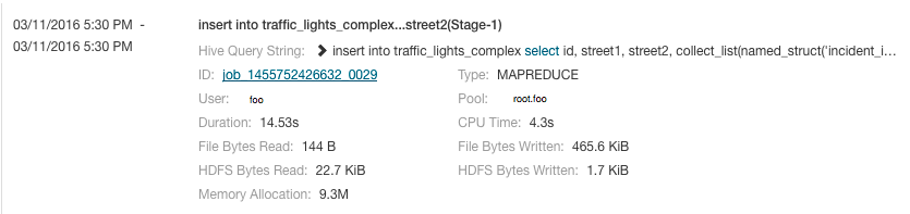 Jobs are ordered with the most recent at the top. Each job has summary and detail information. A job summary includes start and end timestamps, query (if the job is part of a Hive query) name, pool, job type, job ID, and user. For example: