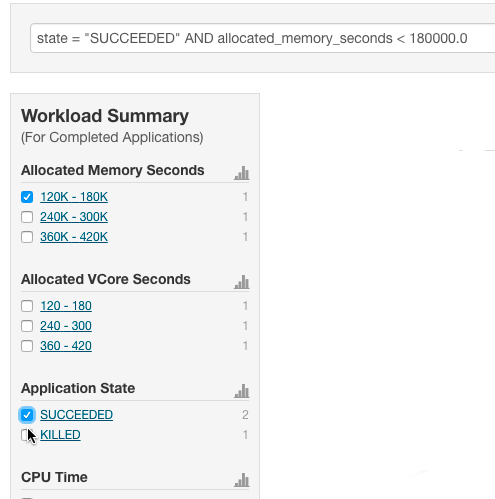 The attributes display in the Workload Summary section along with values or ranges of values that you can filter on. The values and ranges display as links with checkboxes. Select one or more checkboxes to add the range or value to the query. Click a link to run a query on that value or range. For example: