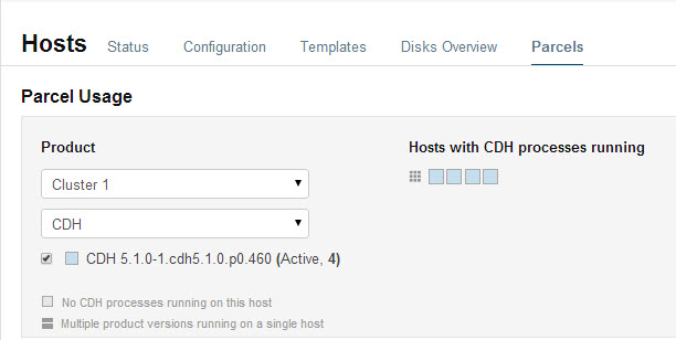 The host map at the right shows each host in the cluster, with the status of the parcels on that host. If the host is running the processes from the currently activated parcels, the host is indicated in blue. A black square indicates that a parcel has been activated, but that all the running processes are from an earlier version of the software. This occurs, for example, if you have not restarted a service or role after activating a new parcel. If you have individual hosts running components installed as packages, the square is empty.