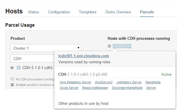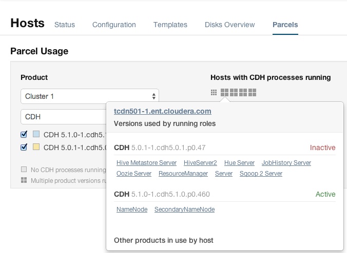 . When you move the cursor over that host, both the active and inactive components are shown. For example, in the image below, the older CDH parcel has been
