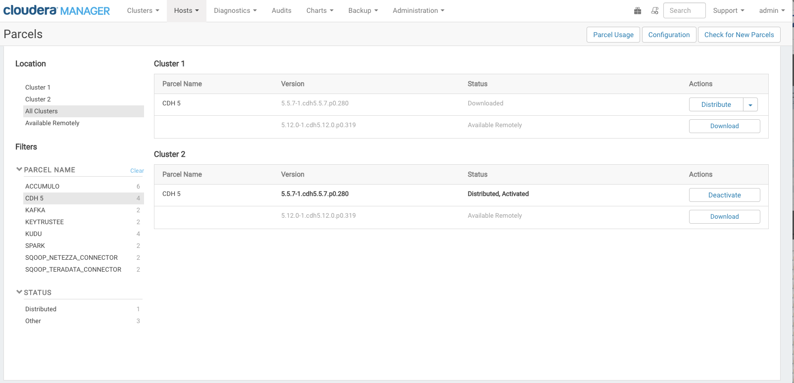 For example, if Cloudera Manager is managing two clusters, the rows in the All Clusters page list the information about the parcels on the two clusters. The Status column displays the