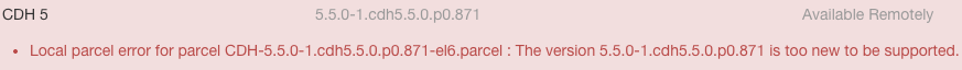 If a parcel version is too new to be supported by the Cloudera Manager version, the parcel appears with a red background and error message: