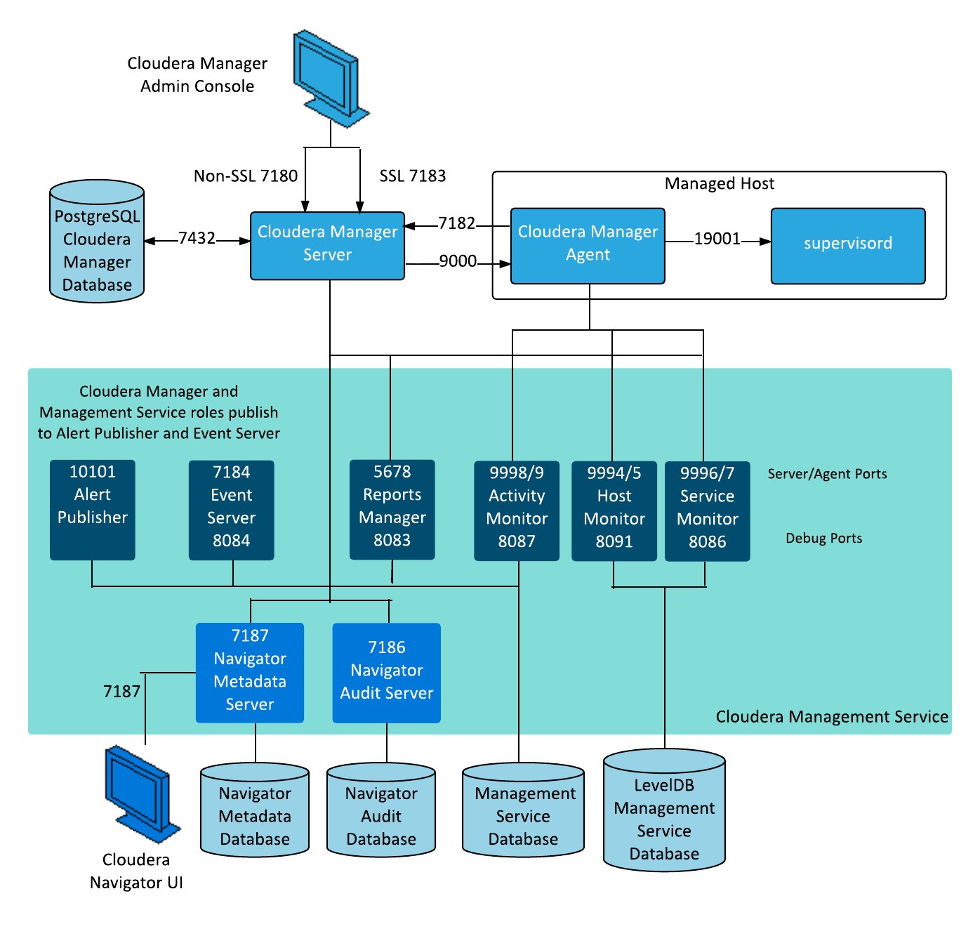 The following diagram provides an overview of the ports used by Cloudera Manager, Cloudera Navigator, and Cloudera Management Service roles: