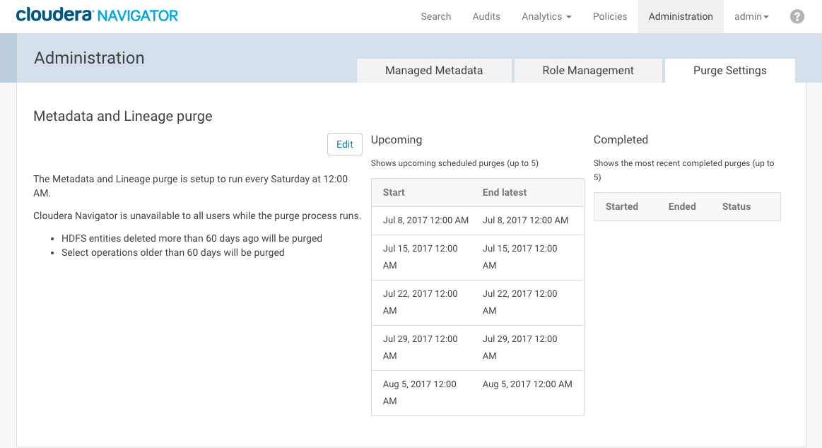 Note: Cloudera recommends scheduling the purge process for non-production hours because other users and processes will be unable to use Cloudera Navigator until the purge process completes.