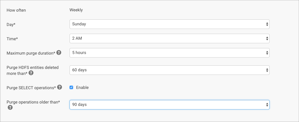 Purge SELECT operations* Enabled Hive and Impala SELECT operations older than days specified in Only Purge SELECT operations older than will be purged.