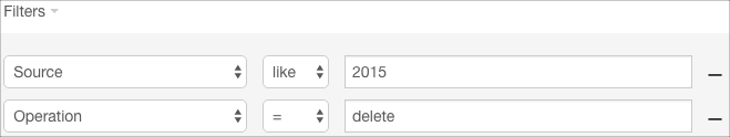 - Click Apply. The operation filter added to the list of filters and applied to Audit Events, returning an updated list containing Audit Events for delete operations from sources like 2015.