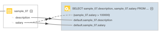 The query returns values from description and salary columns for salaries over 100,000 from the sample_07 table. Because Cloudera Navigator automatically collects metadata from entities, it can render lineage diagrams on any data contained in the cluster, including operations, such as the SELECT query of the example.