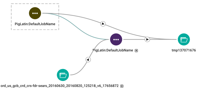 The example shows how one lineage diagram can expand to another. The first image shows a YARN operation (PigLatin:DefaultJobName) that runs an associated Pig script of the same name (DefaultJobName). The solid lines represent data flow relationships, from the source file (in the ord_us_gcb_crd_crs-fdr-sears folder) through the script execution, to the destination (in folder tmp137071676). The YARN operation PigLatin:DefaultJobName is rendered using a dashed (rather than solid) line because it is the starting point for this particular lineage diagram. In lineage diagrams, lines change to the color blue when they are selected. Containment is signalled using the plus icon: