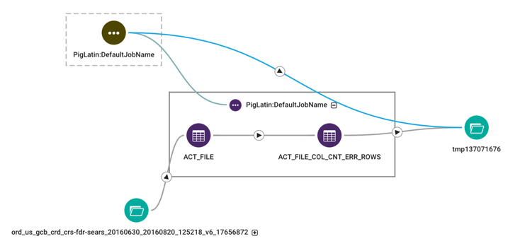 Click the plus icon to expand a parent entity and display child entities. For example, expanding the Pig script reveals the two Pig tables (ACT_FILE, ACT_FILE_COL_CNT_ERR_ROWS) tables referenced by the script. The solid directional line between the two tables indicates the data flow relationship between these two tables.