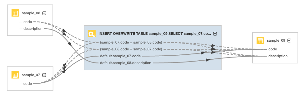 The columns identified in the select clause use solid directed lines to the source table (shown with the Hive Table icon) and a dashed line to the source column of the where clause (shown with the Operation icon).