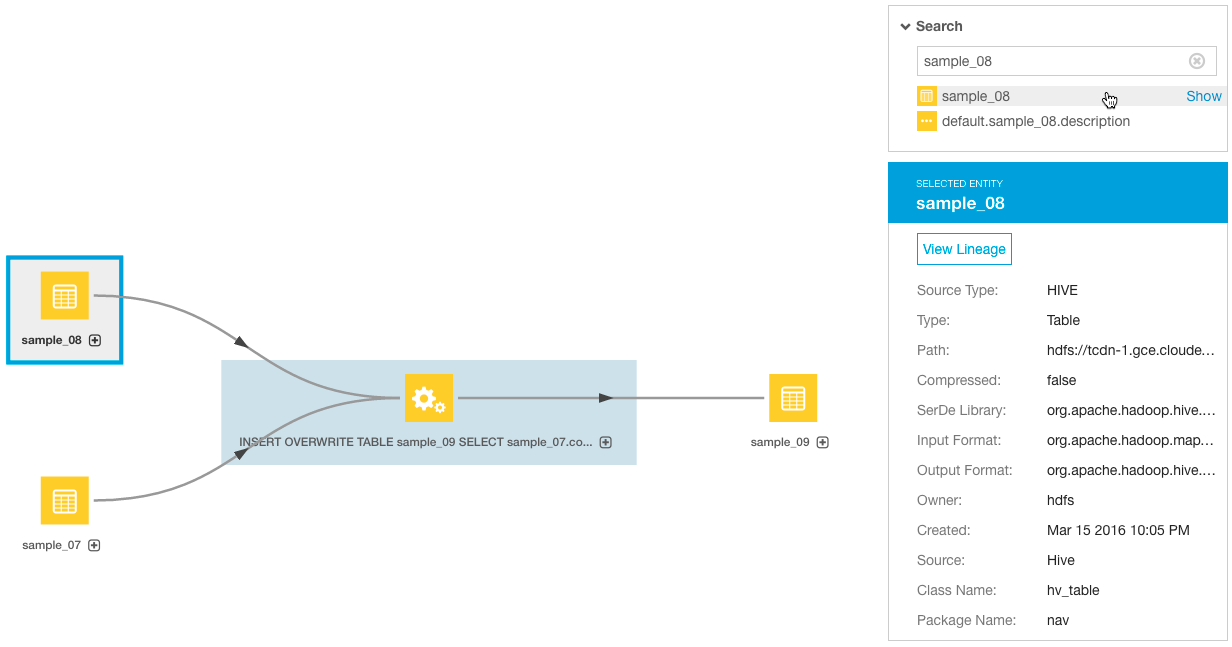 Lineage diagrams are accessible in various ways in the Cloudera Navigator console. This example uses Search to first find a specific entity and then display its lineage diagram. Use this approach if you know the name, data type, source type, or another property value for a specific entity. The example uses the Hive sample data warehouse (installed by default) and assumes the following query has been run: