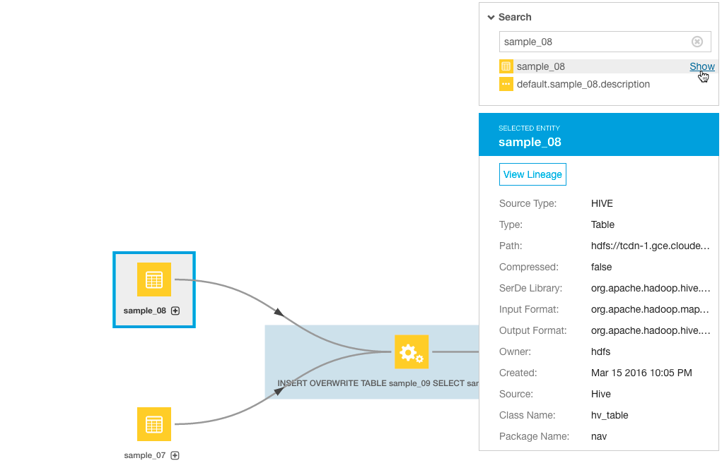 Cloudera Navigator's Search function can be used in the context of an open lineage diagram. This is useful especially when lineage diagrams have hidden entities that are may not be visible.
