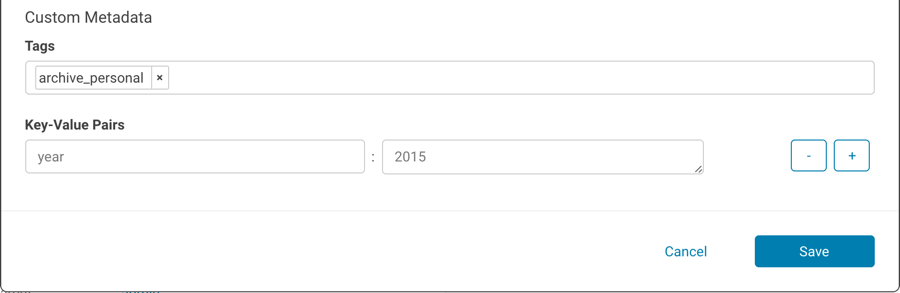 - Custom Metadata: In the Tags field, type a tag and press Enter or Tab to create new tag entries.