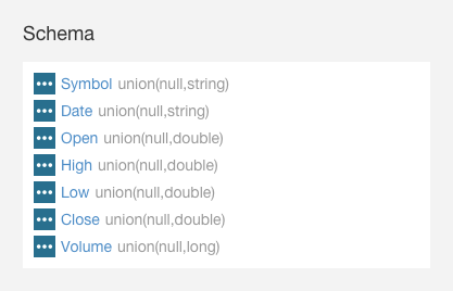 { "type" : "record", "name" : "Stocks", "namespace" : "com.example.stocks", "doc" : "Schema generated by Kite", "fields" : [ { "name" : "Symbol", "type" : [ "null", "string" ], "doc" : "Type inferred from 'AAIT'" }, { "name" : "Date", "type" : [ "null", "string" ], "doc" : "Type inferred from '28-Oct-2014'" }, { "name" : "Open", "type" : [ "null", "double" ], "doc" : "Type inferred from '33.1'" }, { "name" : "High", "type" : [ "null", "double" ], "doc" : "Type inferred from '33.13'" }, { "name" : "Low", "type" : [ "null", "double" ], "doc" : "Type inferred from '33.1'" }, { "name" : "Close", "type" : [ "null", "double" ], "doc" : "Type inferred from '33.13'" }, { "name" : "Volume", "type" : [ "null", "long" ], "doc" : "Type inferred from '400'" } ] }and the kite-dataset command to create a Stocks dataset:kite-dataset create dataset:hdfs:/user/hdfs/Stocks -s Stocks.avsc