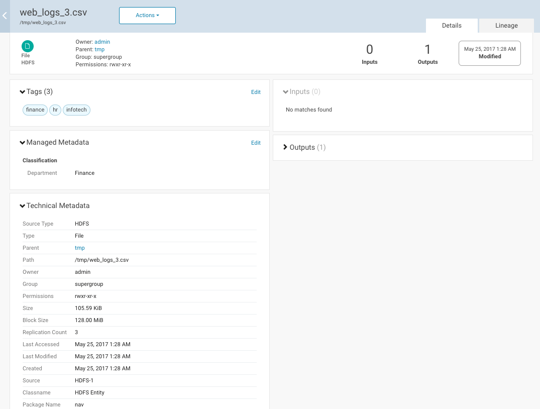 - The Technical Metadata was provided to the entity by the source system, in this example, HDFS.
