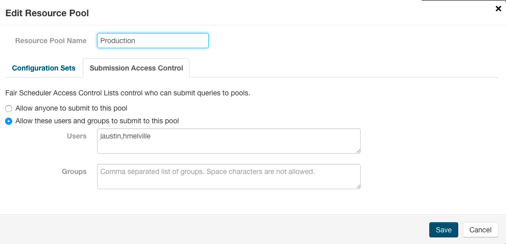 Notice that Anne does not set the pool memory resources, but does set the pool’s Default Query Memory Limit. This is intentional: admission control processes queries faster when a pool uses the Max Running Queries limit instead of the peak memory resources.