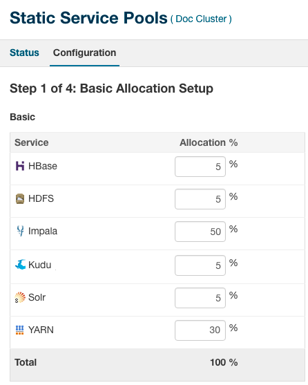 • For mostly batch workloads, you might allocate YARN 60%, Impala 30%, and HDFS 10%.