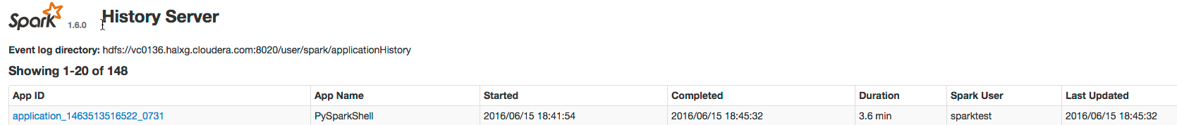 Consider a job consisting of a set of transformation to join data from an accounts dataset with a weblogs dataset in order to determine the total number of web hits for every account and then an action write the result to HDFS. In this example, the write is performed twice, resulting in two jobs. To view the application UI, in the History Server click the link in the App ID column: