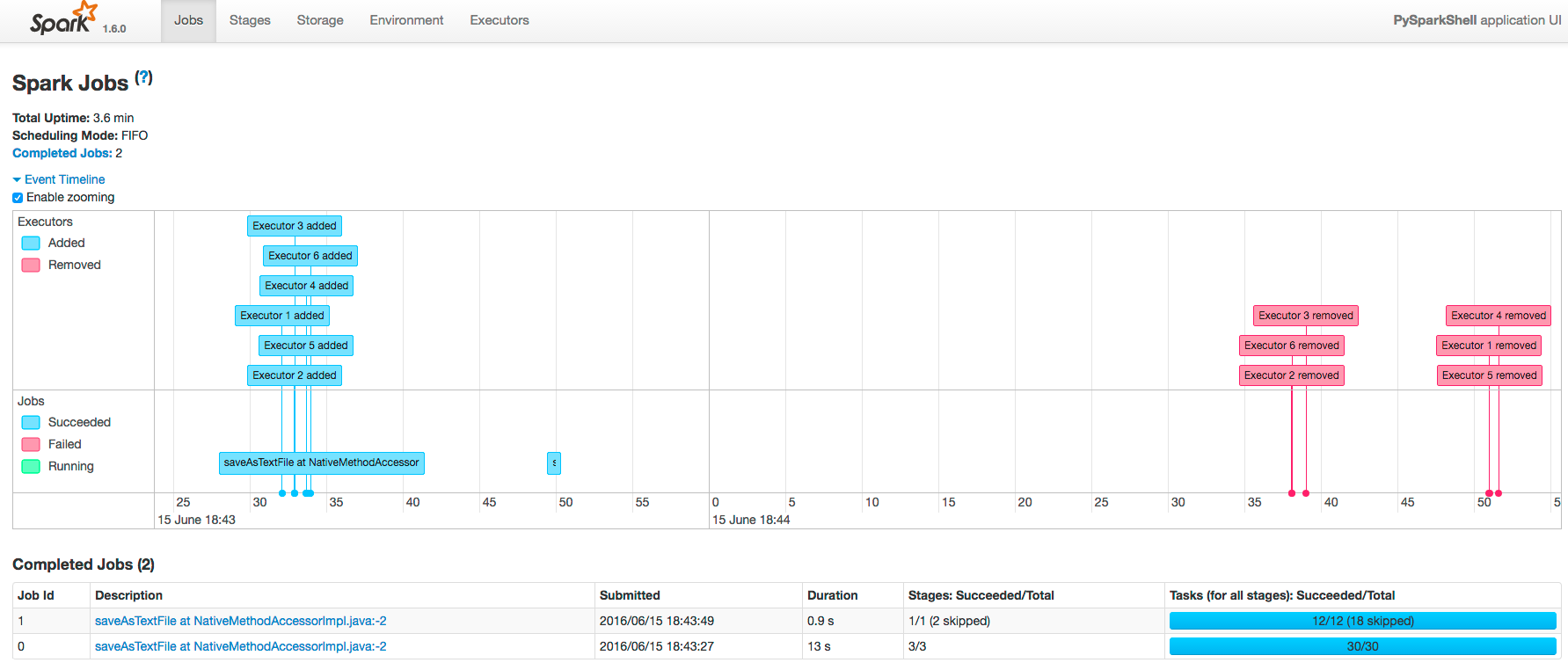 The following screenshot shows the timeline of the events in the application including the jobs that were run and the allocation and deallocation of executors. Each job shows the last action, saveAsTextFile, run for the job. The timeline shows that the application acquires executors over the course of running the first job. After the second job finishes, the executors become idle and are returned to the cluster.