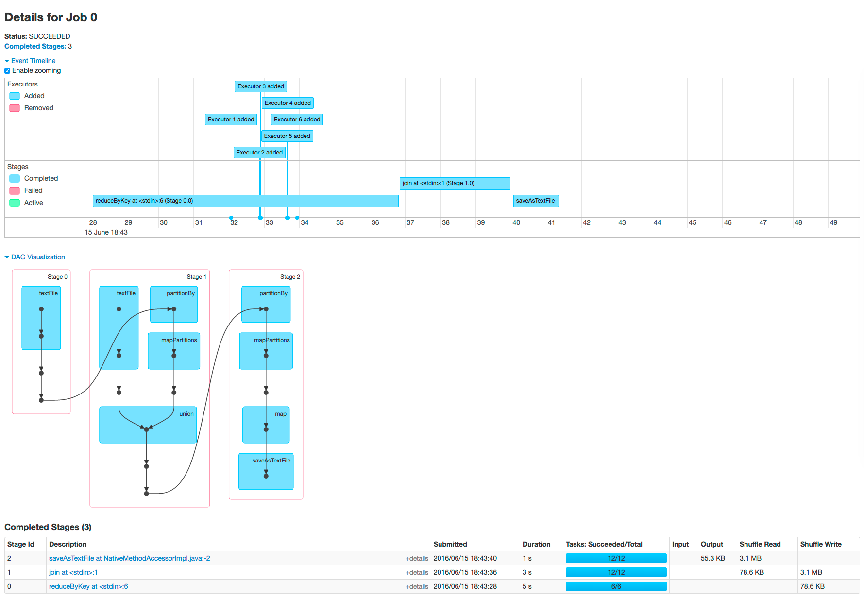 To view the details for Job 0, click the link in the Description column. The following screenshot shows details of each stage in Job 0 and the DAG visualization. Zooming in shows finer detail for the segment from 28 to 42 seconds: