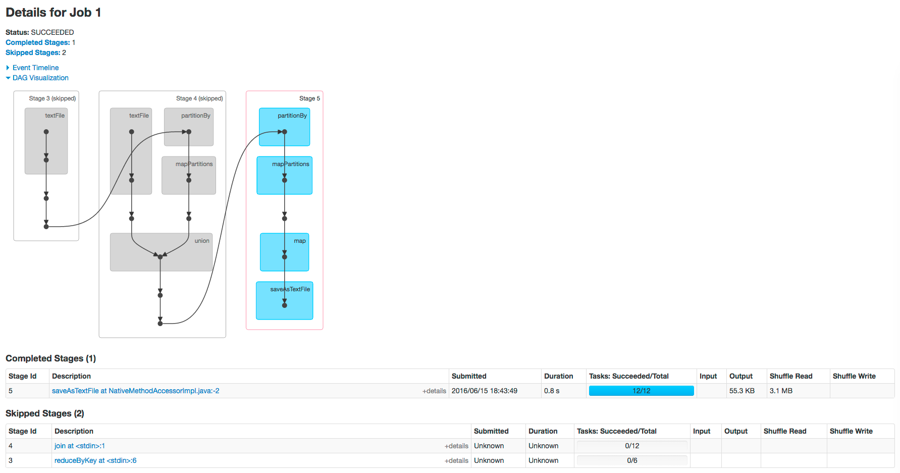 The web page for Job 1 shows how preceding stages are skipped because Spark retains the results from those stages: