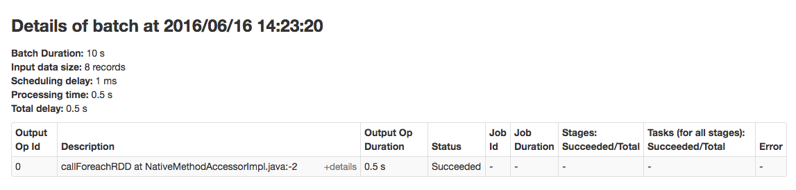 To view the details of a specific batch, click a link in the Batch Time column. Clicking the 2016/06/16 14:23:20 link with 8 events in the batch, provides the following details: