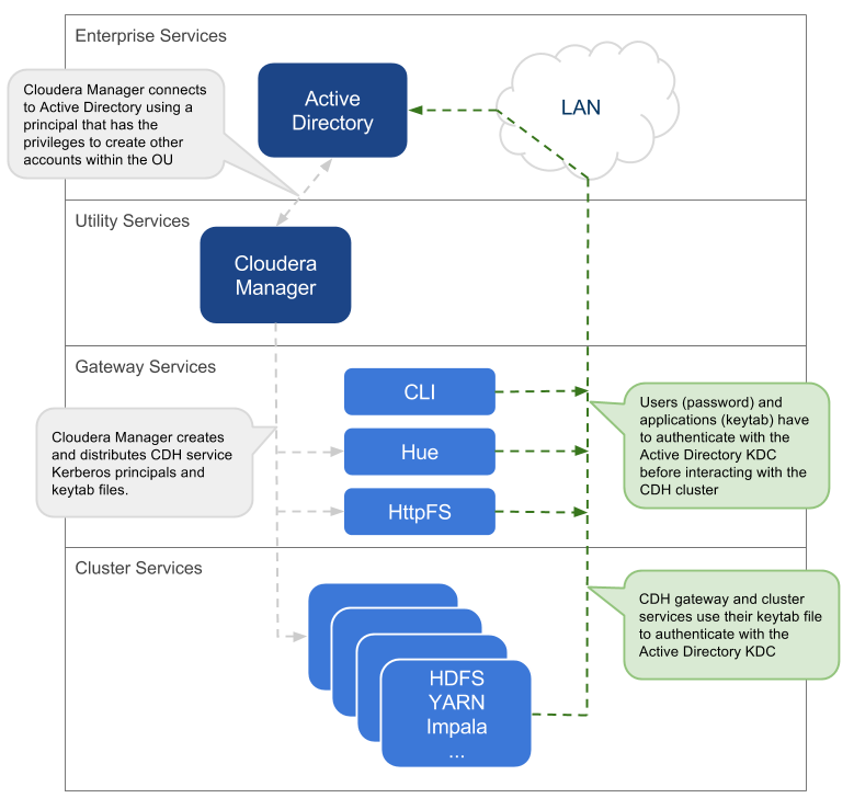| Cloudera Manager | Kerberos (used to authenticate Cloudera Manager to Kerberos-protected services), LDAP, SAML |