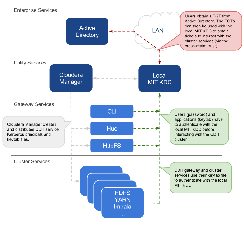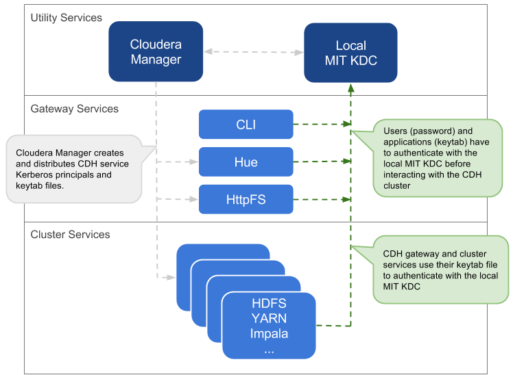 This approach uses an MIT KDC that is local to the cluster. Users and services authenticate to the local KDC before they can interact with the CDH components on the cluster.