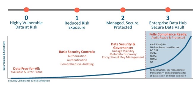 The figure below shows the range of security levels that can be implemented for a Cloudera cluster, from non-secure (0) to most secure (3). As the sensitivity and volume of data on the