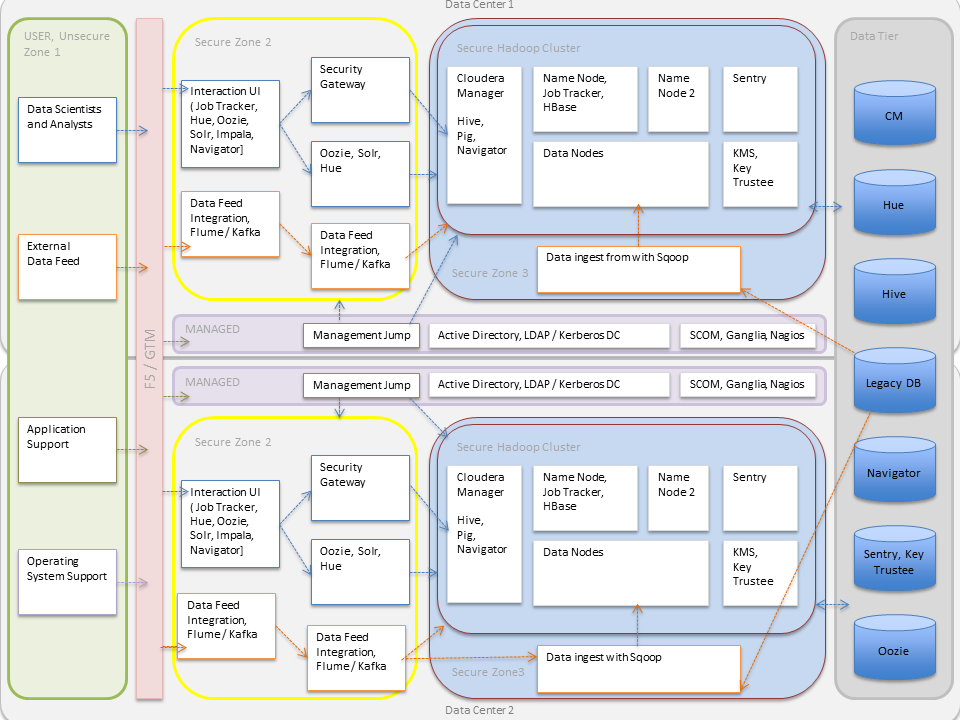 - External data streams are authenticated by mechanisms in place for Flume and Kafka. Data from legacy databases is ingested using Sqoop. Data scientists and BI analysts can use interfaces such as Hue to work with data on Impala or Hive, for example, to create and submit jobs. Kerberos authentication can be leveraged to protect all these interactions.