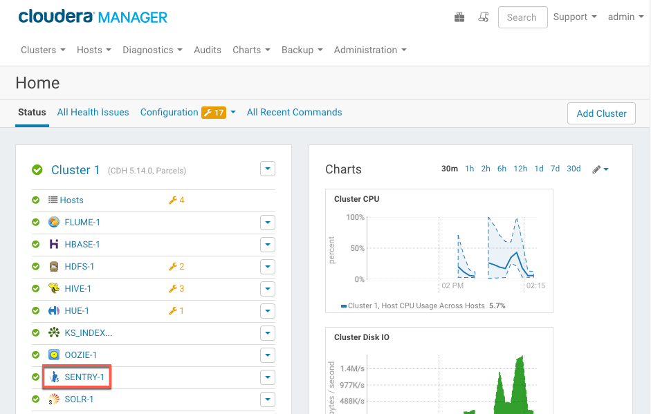 - In Cloudera Manager, open the Sentry service. The following image shows the location of the Sentry service on an example cluster. Click the Sentry service name to open the service.