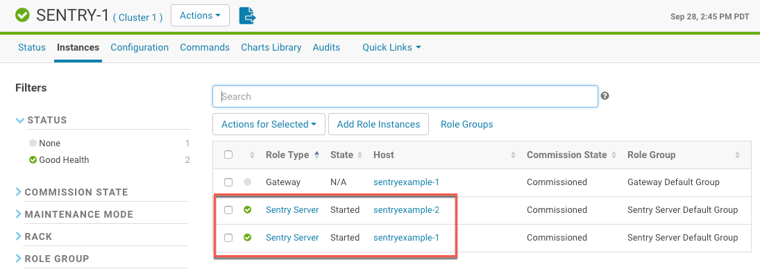 To verify the statuses of the Sentry hosts, open the Sentry service and click the Instances tab.