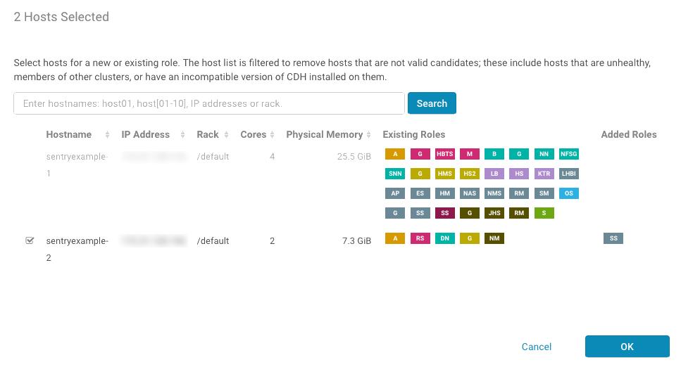 - In the Add Role Instances wizard, click the Select a host button for the Sentry Server. You do not have to edit the Gateway host.