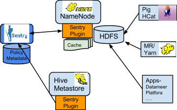 The NameNode loads a Sentry plugin that caches Sentry privileges as well Hive metadata. This helps HDFS to keep file permissions and Hive tables privileges in sync. The Sentry plugin periodically polls the Sentry and Metastore to keep the metadata changes in sync.